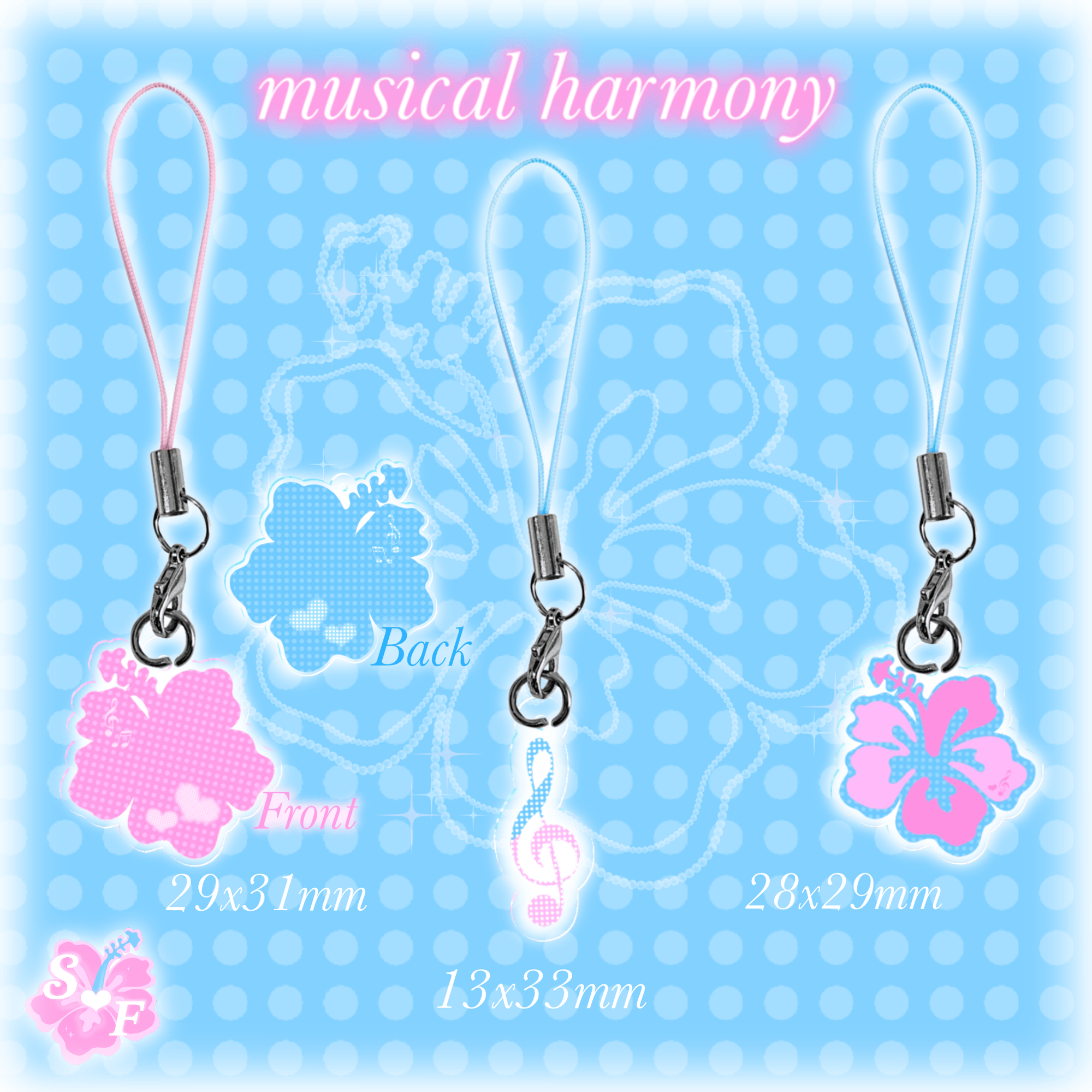 Charm sizes: hearts and hibiscus - 29x31mm musical note - 13x33mm harmony hibiscus - 28x29mm